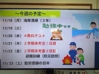 テストウィーク 公開日 2024/11/18 更新日 2024/11/18 最近の水中の様子 11/18(月) 朝から雨が断続的に降り続いています。 子どもたちは傘をさして登校してきました。 「寒くないですか?」 「大丈夫です!」 「テスト前だから風邪とか気を付けてね!」 11/20(水)から4教科テストが始まります。 体調を整え、提出物を準備しておきましょう。