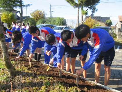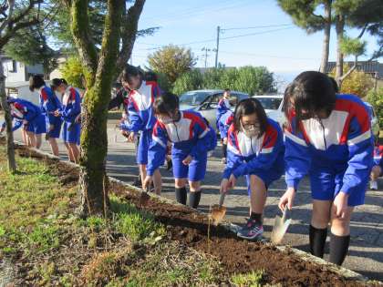卒業プロジェクト チューリップ球根植え 公開日 2024/12/02 更新日 2024/12/02 第3学年 卒業プロジェクト第3弾 本日は良いお天気の中、チューリップの球根をグラウンド脇の花壇に植えました。 来年の5月には色とりどりの花を咲かせてくれることでしょう。ひとつひとつの活動に感謝の気持ちを込めて!!「好きです水橋中学校」