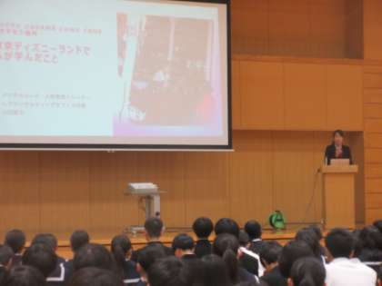 12/2(月)先輩に学ぶ講演会 公開日 2024/12/03 更新日 2024/12/03 最近の水中の様子 本日5限、先輩に学ぶ講演会を実施しました。今回は、川田直子さんをお招きして「私が東京ディズニーランドで学んだこと〜夢をかなえるヒントをつかもう〜」というご講演をしていただきました。川田さんが夢を叶えるまでの過程や、脳の仕組みについてのお話を聞き、生徒は「できる・できない」ではなく「まずは挑戦してみる」ことの大切さに改めて気付くことができました。