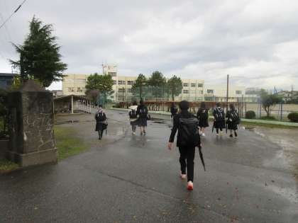 小雨がぱらつき、冷たい風が吹く中、子どもたちは元気に登校してきました。