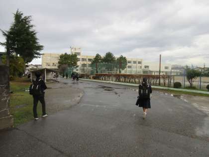 12/5(木) 本日は白岩川の堤防の道路から、生徒玄関方向を臨んでいます。
