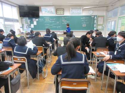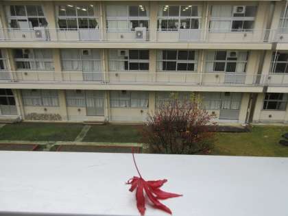 3学年 秋の終わりに 公開日 2024/12/06 更新日 2024/12/06 第3学年 秋の終わり、中庭の紅葉もほぼすべて散りました。 (写真上:1枚だけ紅葉が窓枠に舞ってきました。向こうでは3学年のみんなが学習に取り組んでいます) (写真中:3A 社会「地方自治」) (写真下:3B 数学「円周角」)