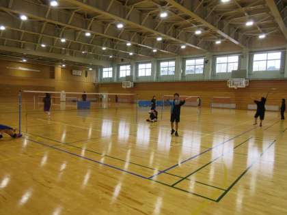 (写真下:バドミントン部 朝早くからコート作りを頑張っていました)