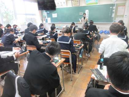 (写真上:2A 国語 書き初め大会の練習か始まりました。今回のお題は『富山の薬』です)
