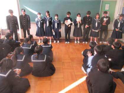 (写真上:学年生徒会から、クラスごとに2学期の反省)