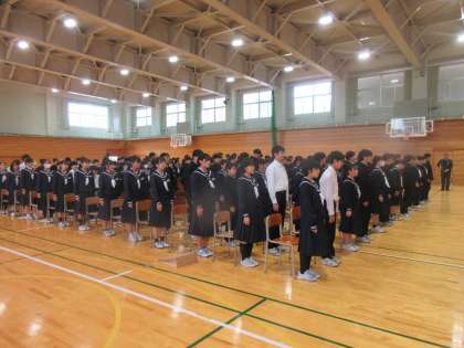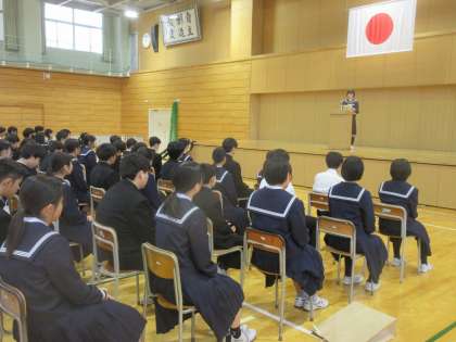 今年もいっぱいありました・・・2学期終業式 公開日 2024/12/24 更新日 2024/12/24 最近の水中の様子 12/24(火) いよいよ2学期終業式です。 終業式に先立ち、受賞報告会が行われました。 富山県児童生徒思考大会、とやま科学オリンピック、美術部のコンクールなどが表彰されました。 (写真中:生徒による意見発表です。『私たちの未来へ〜美しい海を守るために私たちができること』) (写真下:校歌斉唱です)