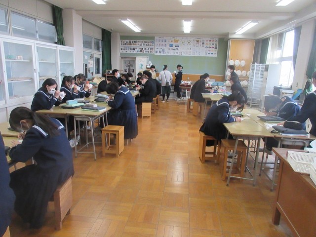 (写真上:3A 美術「サンドブラスト」の技法を用いた作品作り)