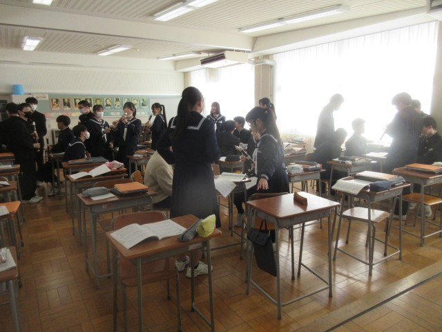 (写真上:3A 音楽『モルダウ』をリコーダーで吹く練習です)
