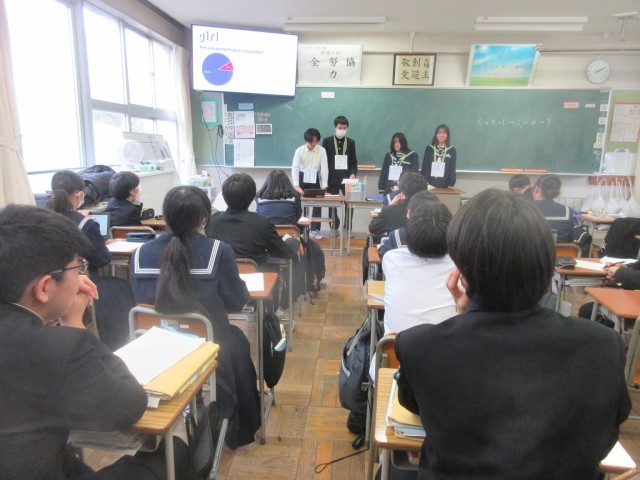 2学年 授業風景 公開日 2025/01/29 更新日 2025/01/29 第2学年 2学年のようすです。(写真上:2A 英語 課題をグループごとに発表しています)(写真下:2B 保健体育 バスケットボールに取り組んでいます)