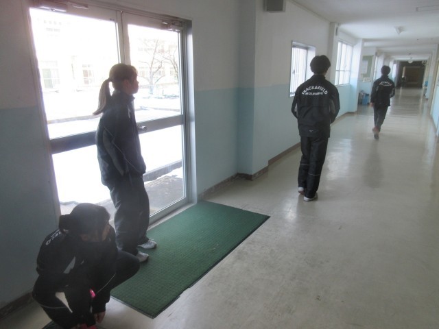 (写真下:陸上競技部 本日はグラウンドコンディションがよくないので、廊下を走ります)