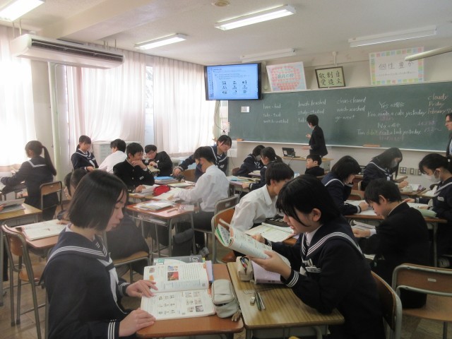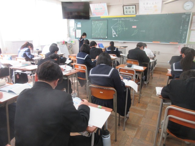 1学年 授業風景 公開日 2025/02/07 更新日 2025/02/07 第1学年 2/7(金) 週末を迎えた1学年のようすです。(写真上:1A 数学「図形の回転」)(写真下:1B 英語 ALTの先生と「Unit 10」で発音練習です)