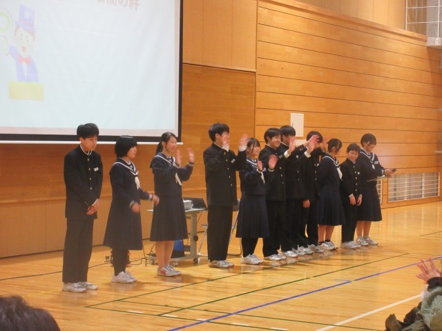 (写真上:校長先生からのあいさつに続き、後期生徒会執行部から学校紹介です。その後、1学年生徒会が中心となり、「仲間作り活動」をしました)