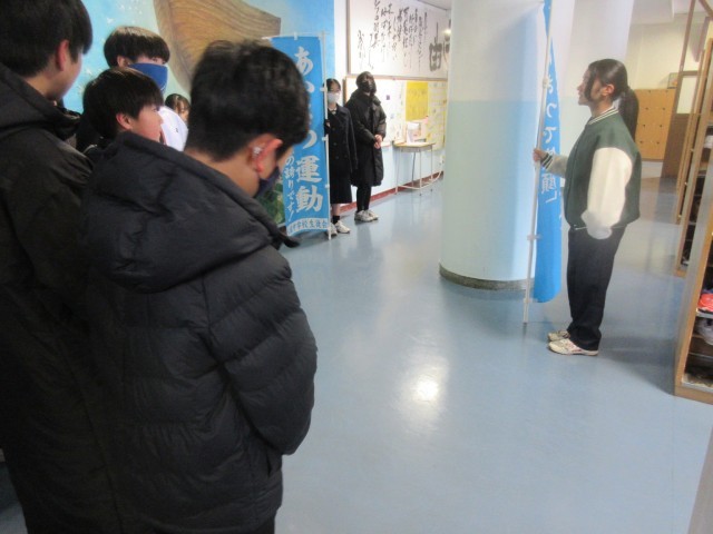 今日から学年末考査が始まります。寒い朝とテストが重なる中、1Aのみんなが「あいさつ運動」に取り組んでくれました。