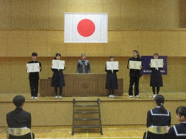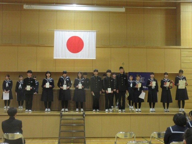 (写真中:学校賞の表彰「自主賞・創造賞・敬愛賞」)