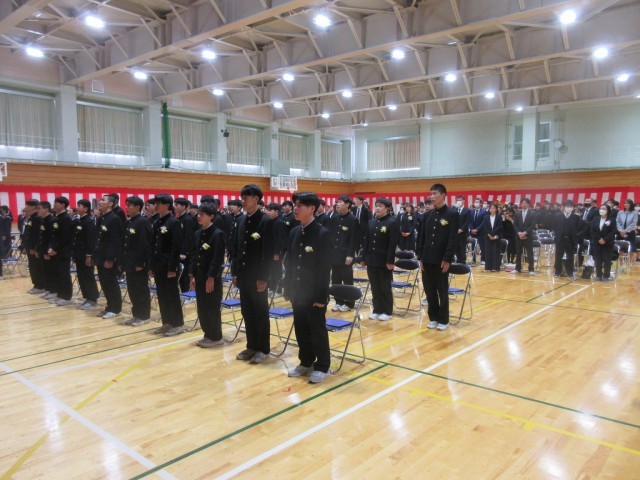 (写真上:校歌斉唱)