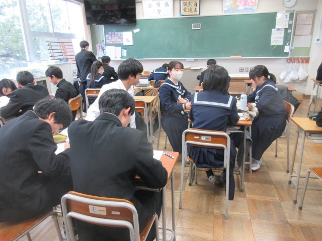 (写真下:2B 数学 仲間と協力して問題に取り組んでいます)