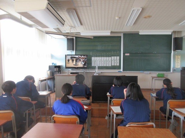 (写真上:吹奏楽部 過去のコンクールのDVDを見ながら、来年度のめあて等を考えました)
