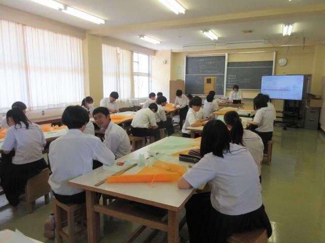 (写真下:2B 家庭科「布を切ってバッグを作ろう」)