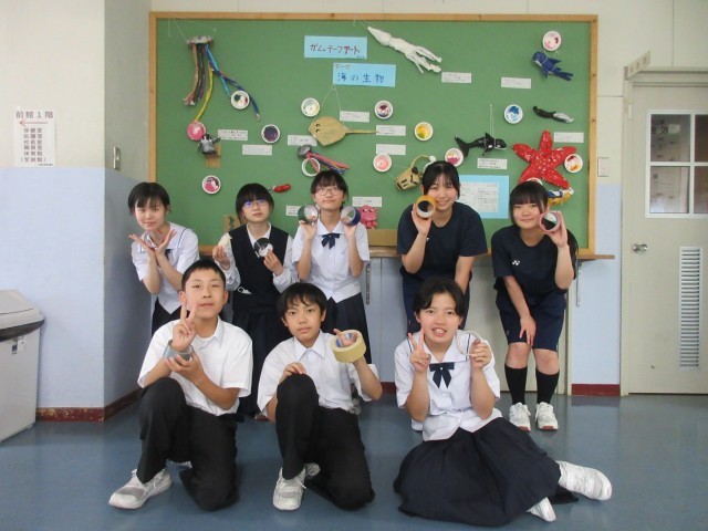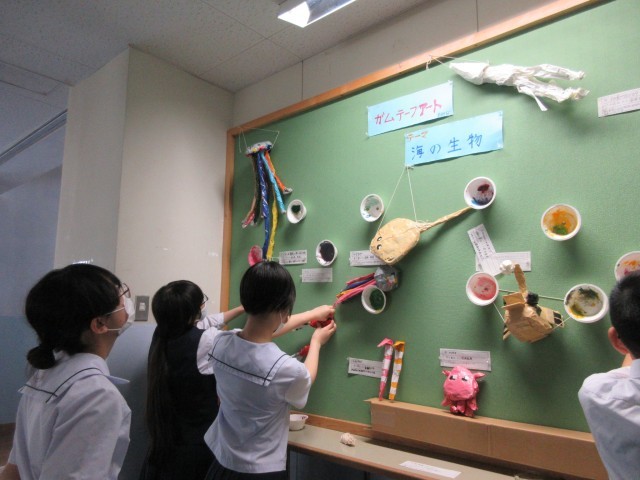 こんにちは!美術部です。先日制作したガムテープアートを放送室前に掲示しました。立体作品を壁面に掲示するのは初めてでしたが、部長や副部長を筆頭に、みんなで考えて載せたり吊したりして、協力して掲示ができました。