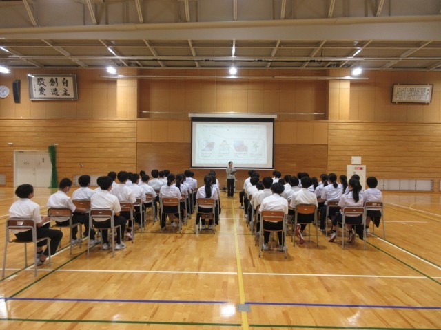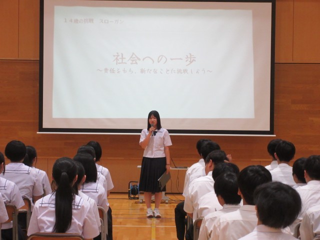 5時間目に「社会に学ぶ『14歳の挑戦』」の結団式を行いました。 代表生徒は「さわやかなあいさつ、自分から学ぶ姿、ていねいな言葉遣い、事業所や保護者の方への感謝の気持ちを大切にして、成長した姿で再会しましょう。」と話しました。最後には、スローガンの「社会への一歩」を達成するために学年で円陣を組み、一歩を大きく踏み出しました。