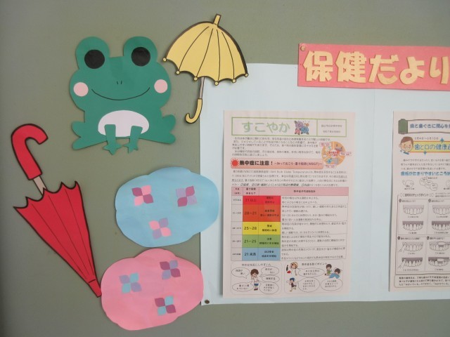 保健室前には、あのカエルさんが傘をさしています(昨年度の記事をご覧ください)。