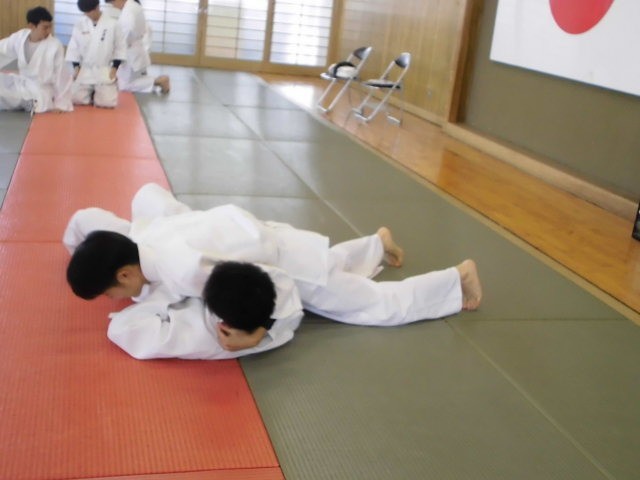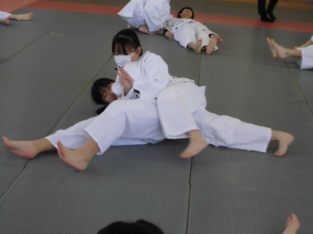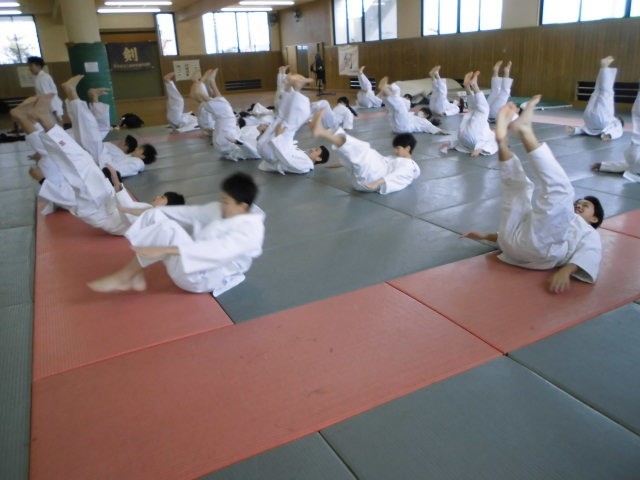 体育 柔道の授業が始まっています。ペアになって技を掛け合い練習しています。