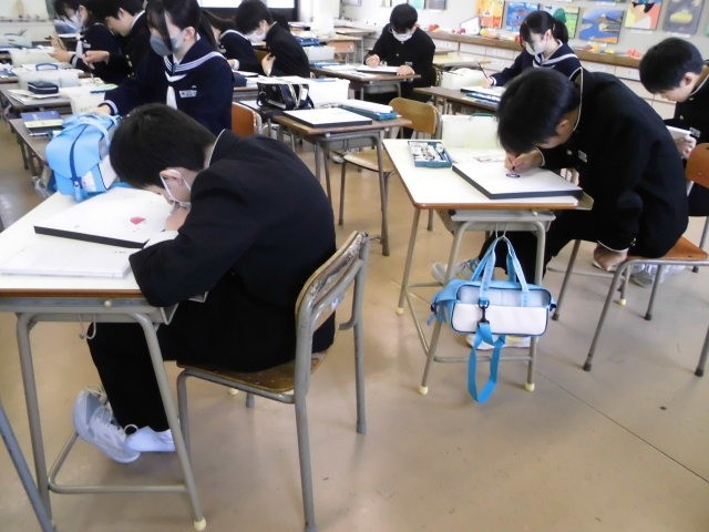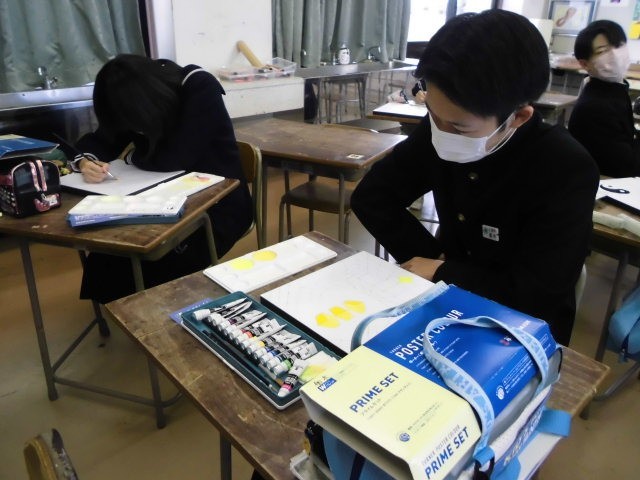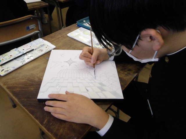 美術 明度、彩度を意識し、立体にふさわしい塗り方を考えながら作業していました。
