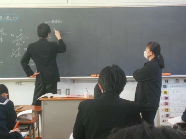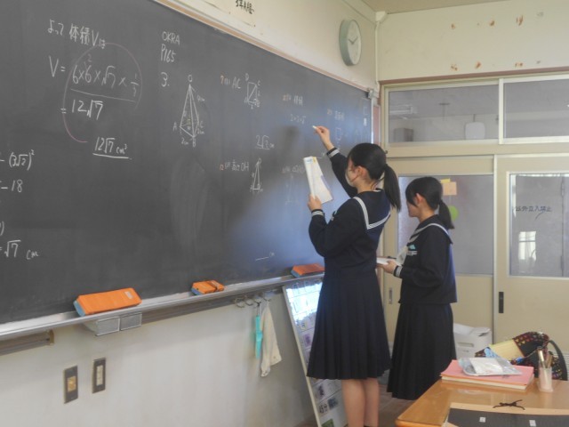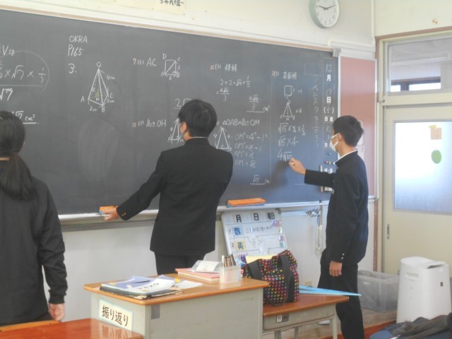 3年生 学習の様子 公開日 2025/12/23 更新日 2025/12/19 3年生 数学 三平方の定理と空間図形について学習しています。立体の対角線や高さを求めるとき、三平方の定理がとても便利だとわかりました。