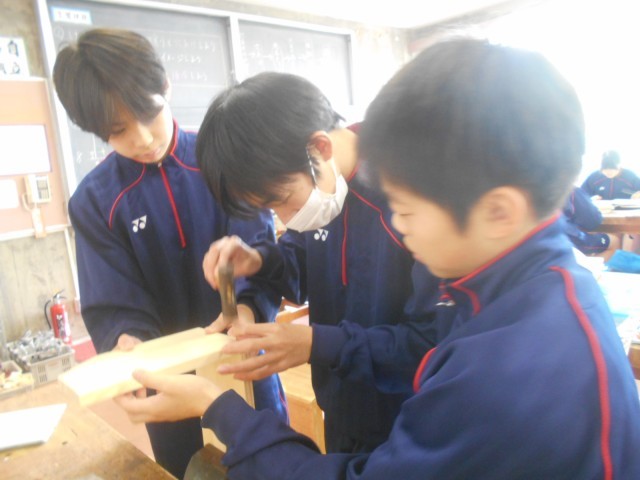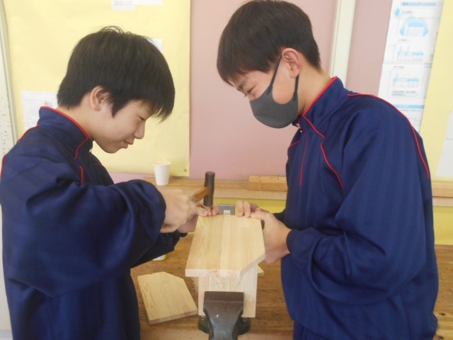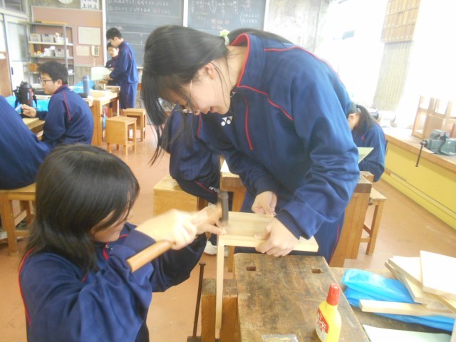 技術 本棚作りの続きです。くぎ打ち(接合)に入った人が増えました。協力しながら進めています。