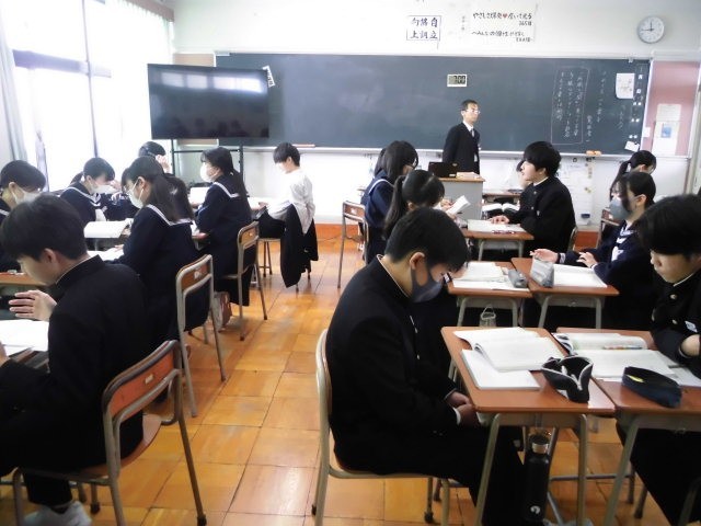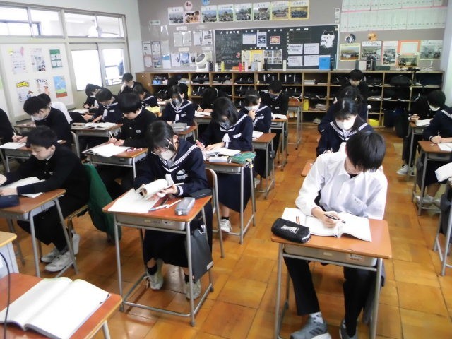 国語 『それでも、言葉』をという説明的文章を読んでいます。理解しにくい表現が使われている難しい文章ですが、課題について自分の考えを書いたり、言い合ったりしています。