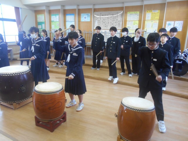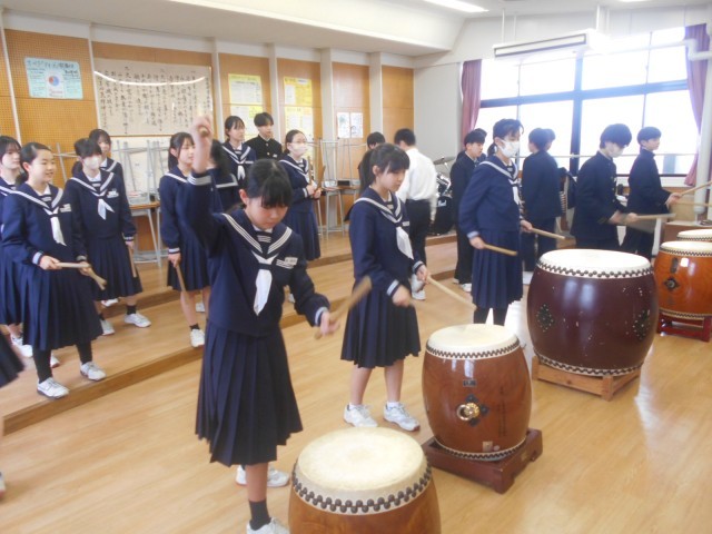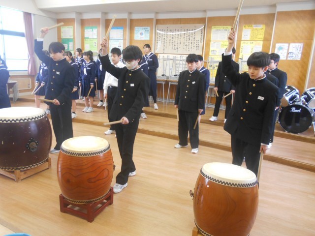 音楽 三成太鼓の練習中です。少し慣れてきたようです。
