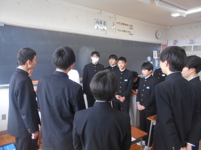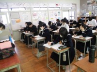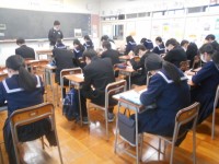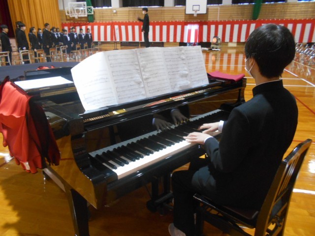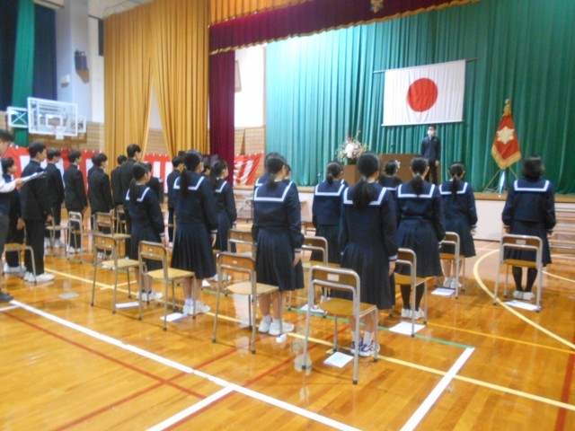 式練習 明日の予行に向け、卒業式の練習を頑張っています。礼のタイミングや式にのぞむ態度を確認しました。パートに分かれた歌練習、全体練習もしました。