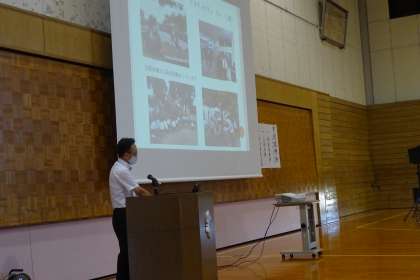 教務主任の先生からは、三成中学校での学校生活について1年生から3年生になるまでの3年間について、生徒会活動について、部活動についてなど詳しく説明がありました。最後に、三成中学校の校歌を紹介しました。