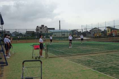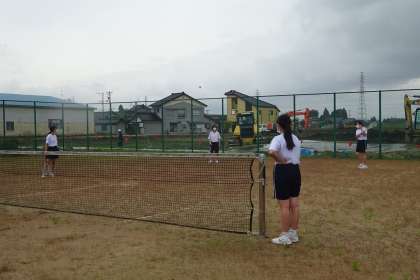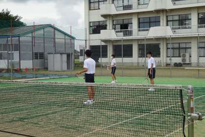 3年生もソフトテニスを行っています。3年目になると結構上達していて、ラリーが続いていました。3人一組になって、試合形式で練習していました。