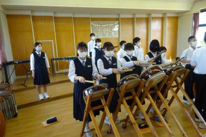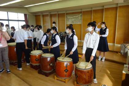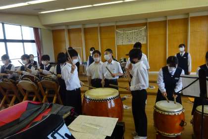 2年A組の音楽では、昨年に続き太鼓を使った学習をしています。今年、2年生が「三成太鼓」を3年生から引き継ぐため、今日は「三成太鼓」のリズムで叩いてみました。