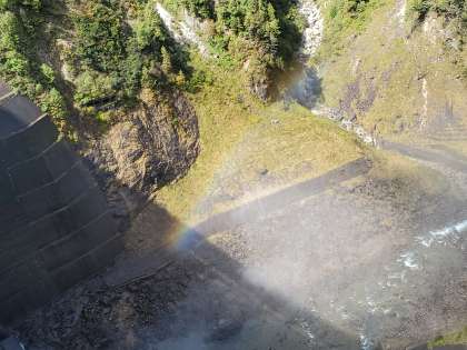 修学旅行 その17 公開日 2021/10/06 更新日 2021/10/06 3年生 10月6日(水) 暑いくらいの天気になってきました。景色も素晴らしいです。ダムからの放水に日が射して、虹が見えます。分かりますか?