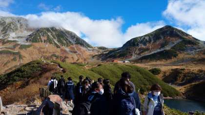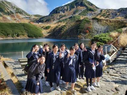 修学旅行 その23 公開日 2021/10/06 更新日 2021/10/06 3年生 10月6日(水) みくりが池をバックに写真を撮りました。地獄谷が近づくとイオウのにおいがしてきました。上ったり、下りたりは部活動引退後にはハードな人もいたようですが、全員けがもなく散策を終えました。