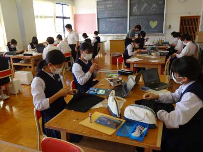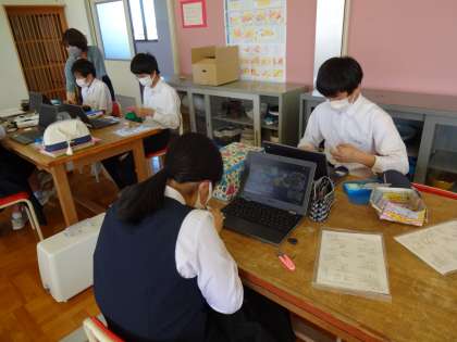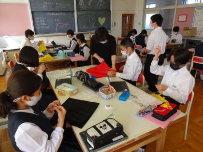 2年生は、現在コンパクトエコバッグを製作中です。バッグの本体に刺しゅうを付けたり、バッグの止めテープにボタンを取り付けたりしていました。各自で必要なタイミングに動画を見て縫い方を確認をするなど、クロムブックを効果的に活用していました。また、学びサポートの先生にも支援していただいており、より安全に効率よく作業を進めていました。