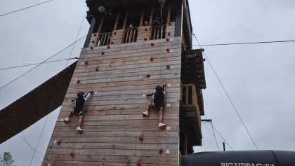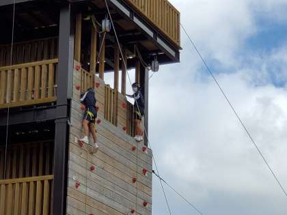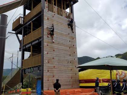 修学旅行 その36 公開日 2021/10/07 更新日 2021/10/08 3年生 10月7日(木) カベダスは、壁を上るアトラクションです。怖い〜と言いながら上まで上りきる生徒がたくさんいました。