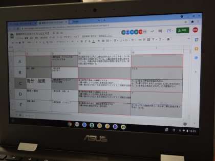 各グループで出し合った考えをGoogleスプレッドシートに入力し、学級全体で共有しました。