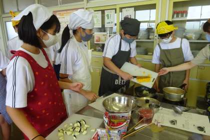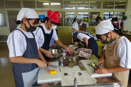 調理実習も何度か経験し、包丁さばきも上手になってきました。今日は「カポナータ」と「コンソメスープ」をつくります。「カポナータ」とは簡単にいうと、トマトソースを使った野菜の煮込み料理です。