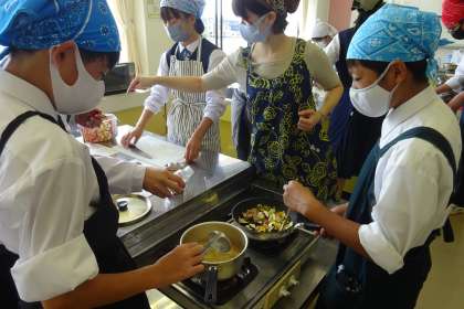 「カポナータ」は、たまねぎ、ピーマン、パプリカ、ベーコン、なすと見た目にも色鮮やかで食欲をそそります。B組は全員エプロンをしていました。当たり前のことを当たり前にできることは、大事なことです。