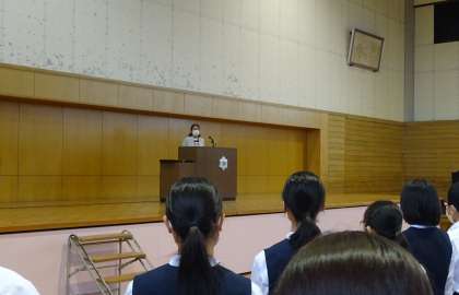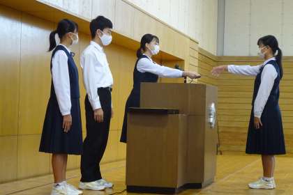 校長から、「いよいよ3年生から1・2年生へとバトンが渡されました。前期生徒会長が、3年生が生徒会の一員として後押しすると言ってくれました。これから生徒会活動の中心となっていく1・2年生は、指示されたからやるのではなく、自分で気づき・考え・実行して、主体的に活動する生徒会を創ってほしい。」と激励の言葉が伝えられました。