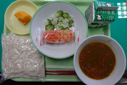 今日は、ソフト麺でした。人気のカレー味のソースだったので楽しみにしていたのでは?また、チーズドッグが給食に付いていたのは初めてではないでしょうか?秋の果物、柿も甘くておいしかったです。