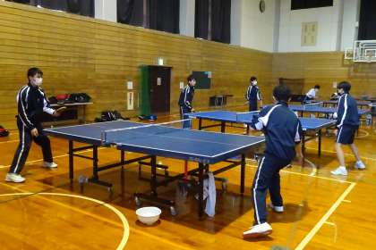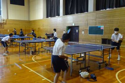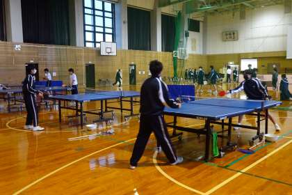 卓球部 公開日 2021/10/20 更新日 2021/10/20 部活動 10月20日(水) 卓球部が新人大会に向けて練習していました。今年の新人大会は9月開催が延期になって、10月〜11月に無観客で行うことになりました。すでに大会が終了した部活動もありますが、卓球部は、11月に行います。顧問の指導の下、練習に励んでいます。