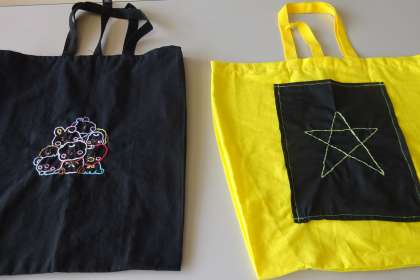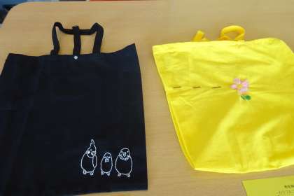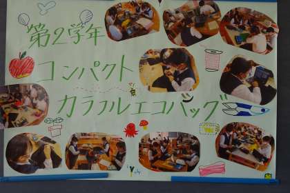 2年生が家庭科でつくった「コンパクト カラフル エコバック」です。刺繍もほどこし、個性を出しています。3階の調理室に展示してあります。