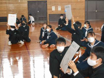 学年生徒会が企画・運営し、ルールについての劇や校外学習に関連するクイズを行いました。班ごとに話し合いながらクイズに答えることで、改めて活動時間や見学場所について確認することができました。