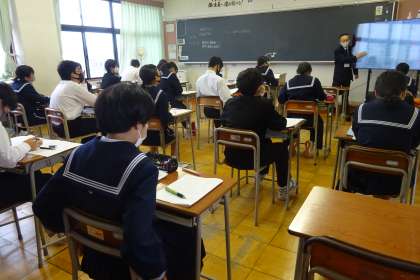 中教研学力調査問題を復習しました。モニターに問題文を映して、先生がポイントを説明しています。問題文と答案を照らし合わせて、メモしながら取り組んでいる姿がみられました。