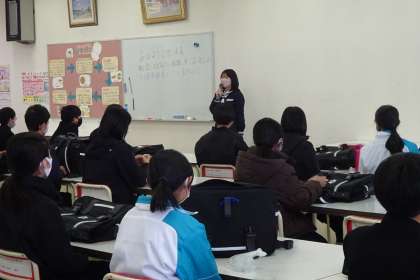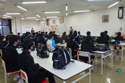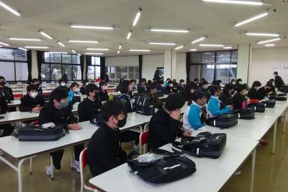 写真は、ランチルームで行った出発式の様子です。校長先生から出発にあたり、激励の言葉をもらいました。そして、学年を代表して生徒が挨拶をしました。