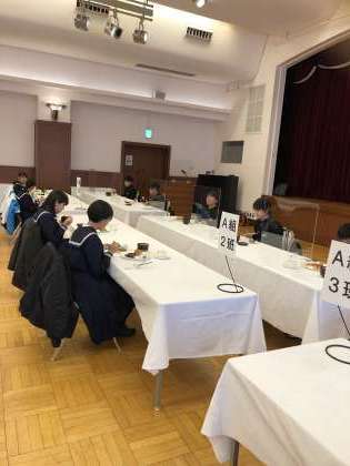 1年 校外学習 その8 公開日 2021/11/11 更新日 2021/11/11 学校行事 11月11日(木) いつもの給食とは違う雰囲気とメニューに、生徒は緊張して食べているようにみえます。おいしそうですね。